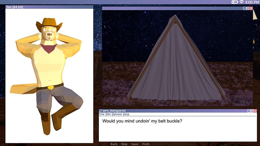 Please be informed that several errors have been discovered in his programming. Aero has been known to become promiscuous or make sexual advances. If this happens, please close the software and report the bug below, including instructions on how to recreate it.