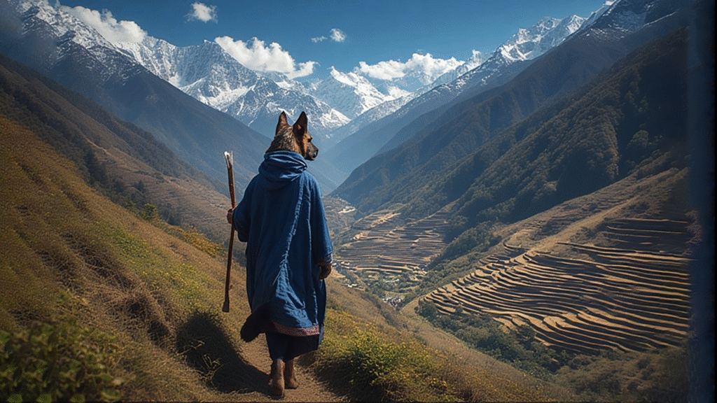 The Lama climbs through what is now Nepal on his way back to Tibet.